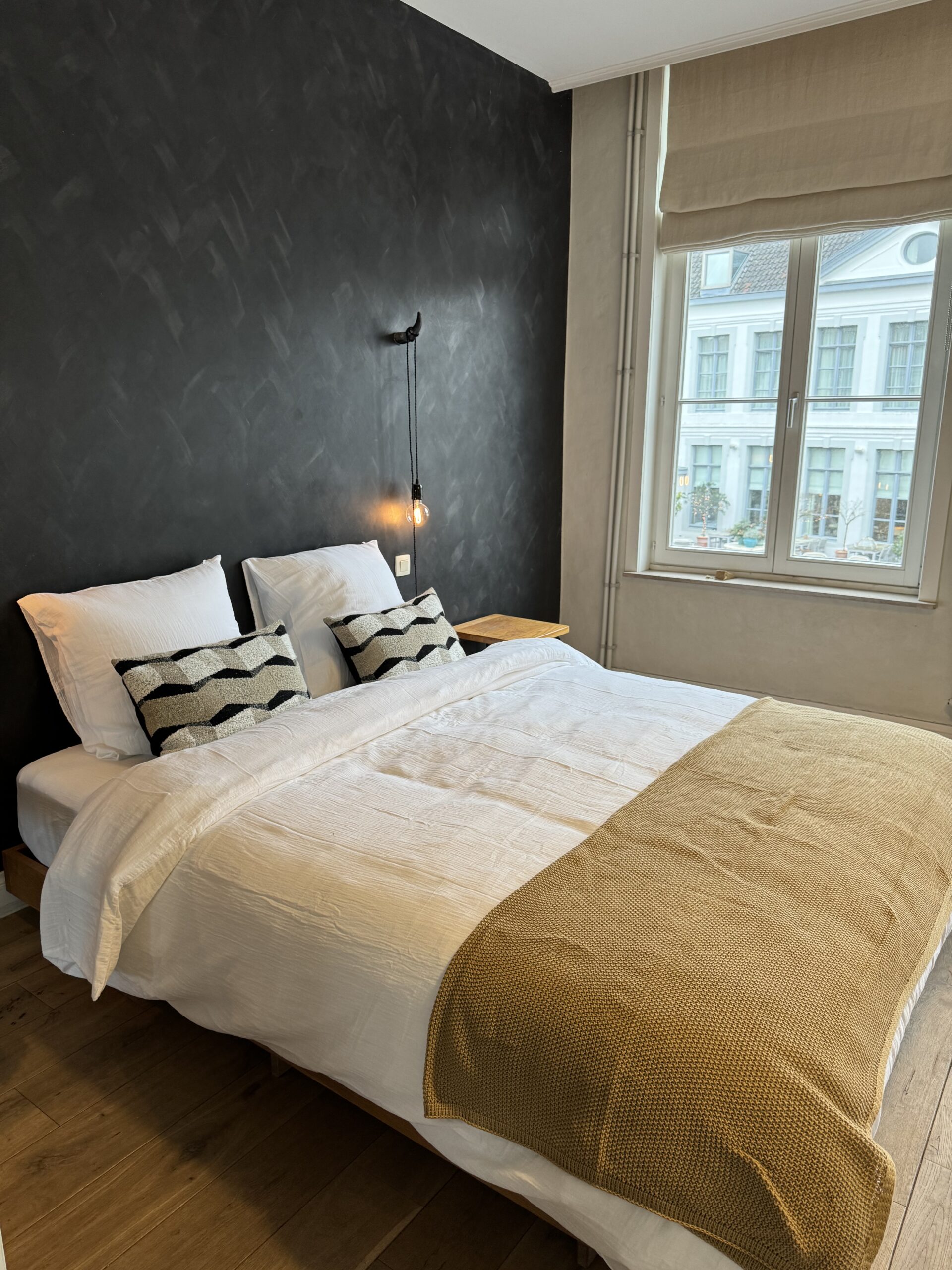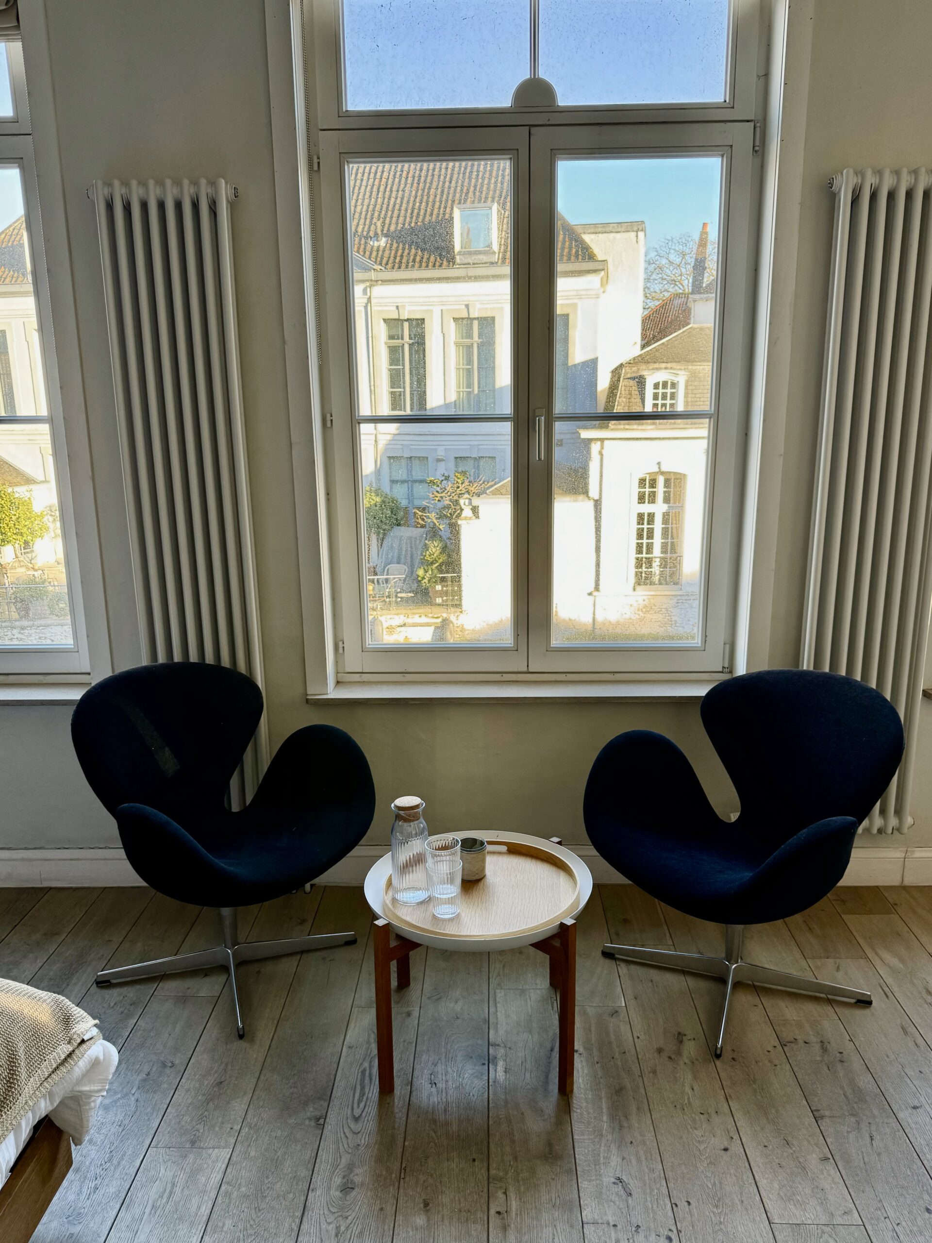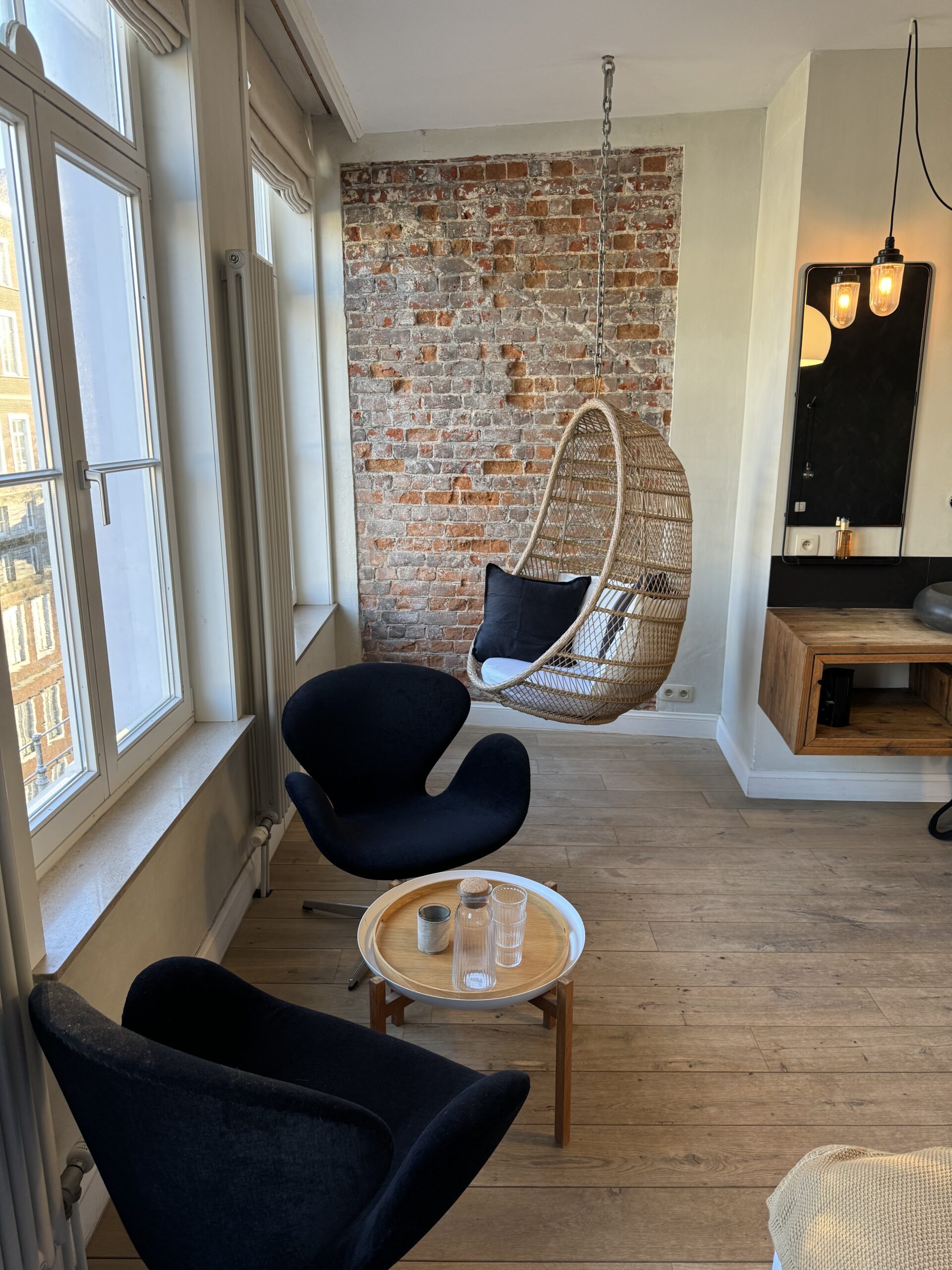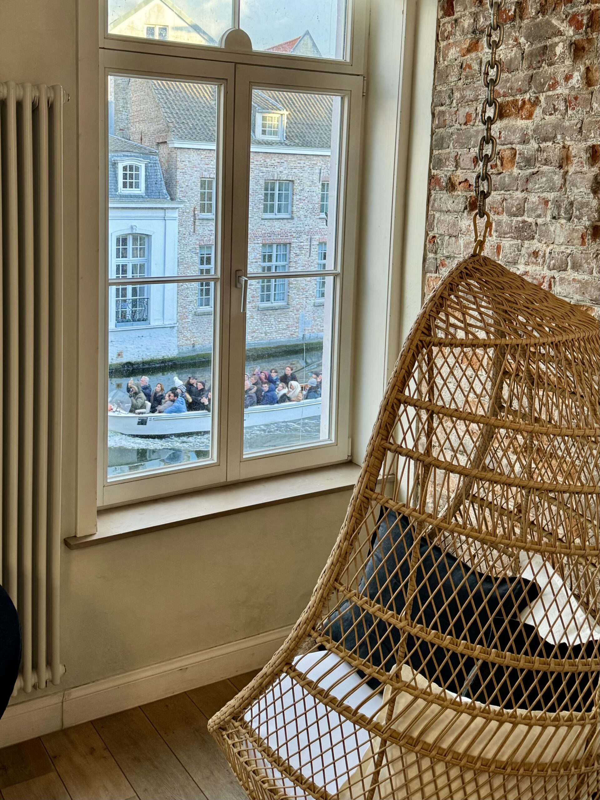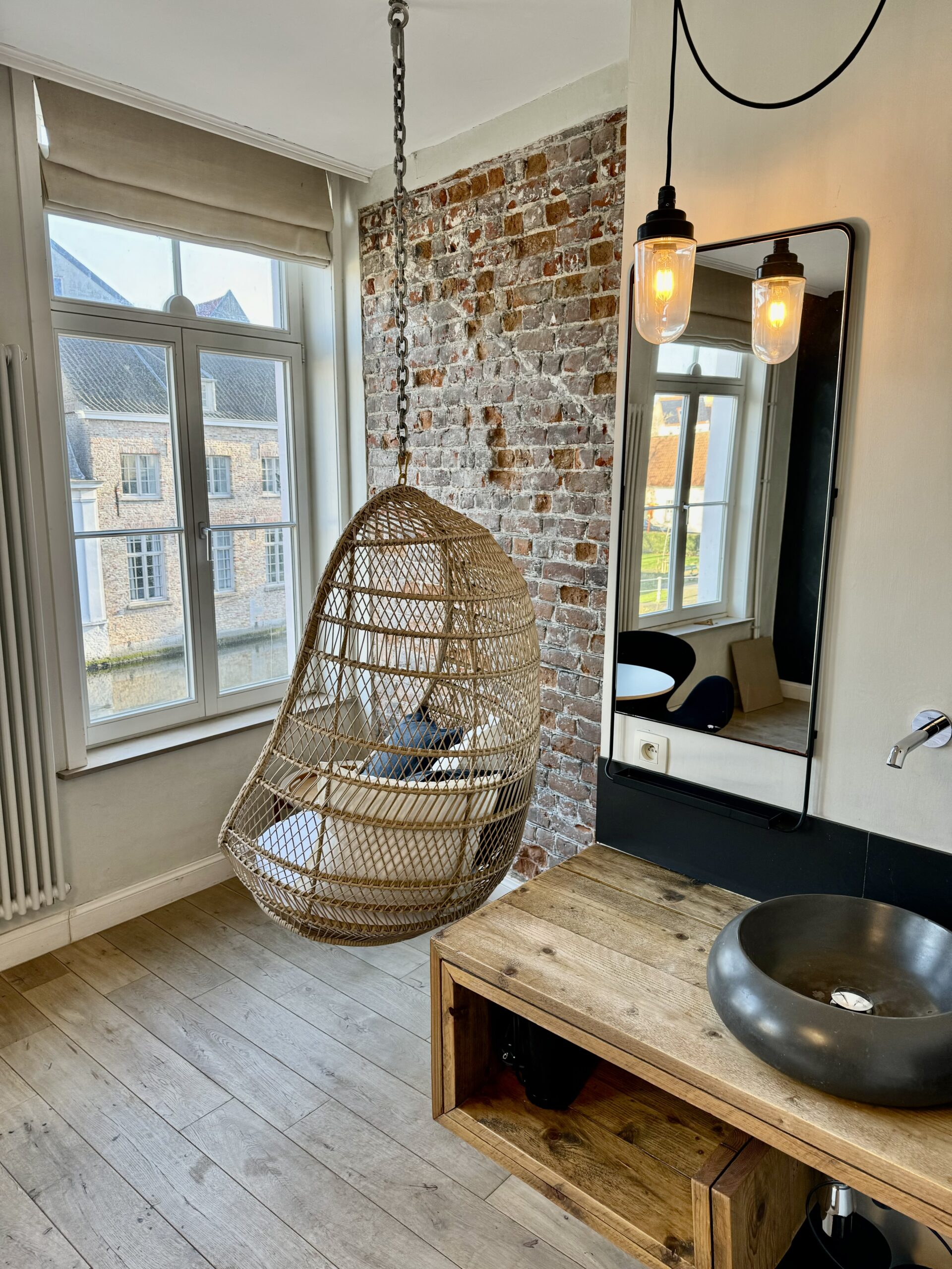 Large room (more than 25 m2) overlooking the canals. It has a large double bed, a bathroom with wc, a seating area with two Swan armchairs and a hanging chair. Call or e-mail us to get the lowest rate.